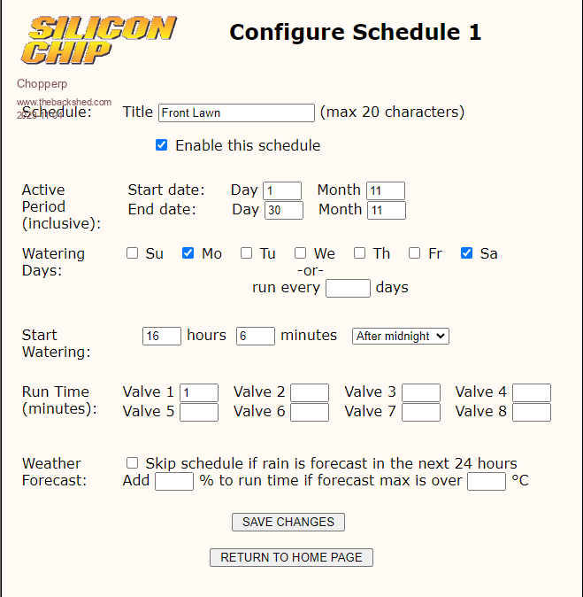 On setting the watering days, the prescribed timer does not appear to be get set for the current day [Mo] unless [Sa] is selected as well, in fact selecting just [Sa] will set the timer for the set time for today & run at that time. (Set time > than current time). In all other cases, the auto refresh timer gets set to midnight.