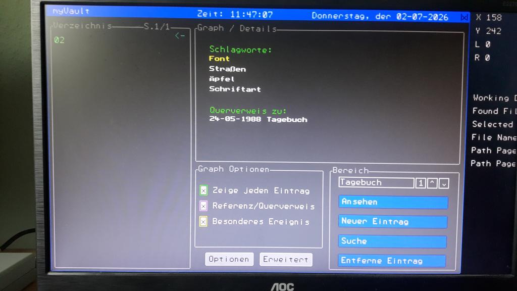 this is pretty impressive! Is there any chance that you come up with another font like the one you initially posted with german umlaute? I called it the "amiga" font, but I think it isn't what the file / font is named originaly, but there is the Amiga "A" in it   . I am using it for my Diary / Journaling program that I am currently working on. But it is "only" 8x8. Maybe there already is a little bigger font with the full set of chars? I don't know. Fact is: I am really thankful, that you came up with those "umlaut" font. I already created one myself about a year ago (or so), but it can't beat yours