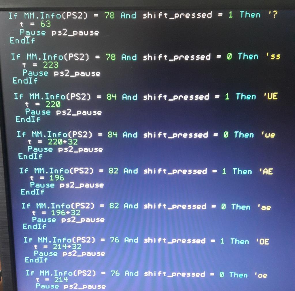 For my PS/2 programs it is no problem with re-mapping, but I looked in the manual and thought I found the equivalent of MM.INFO(PS2) = MM.INFO(USB) but it is not! This only gives the device number... I have no clue if re-mapping USB-keyboard inputs is possible at all, so I can "catch" the usb-code before the (re-mapped) Font character is printed. Peter ?? Anyone??