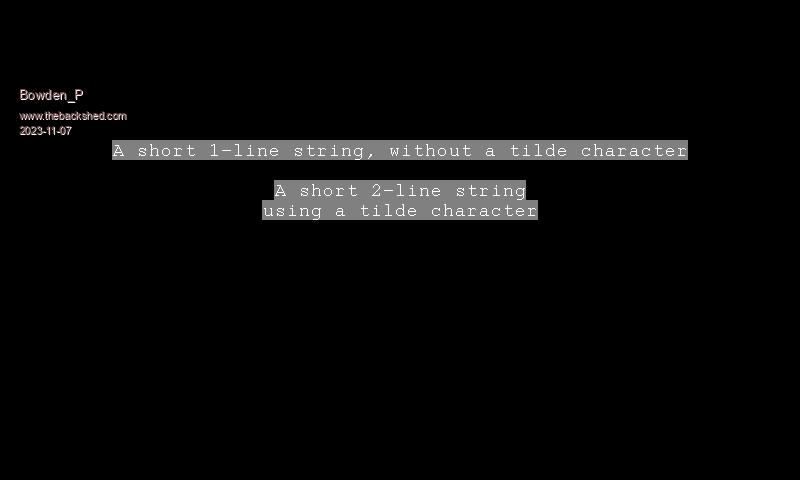 text 400,235,"A short 2-line string Using a tilde character",CM,,,rgb(white),rgb(gray)            ' Original Tilde string for comparison,