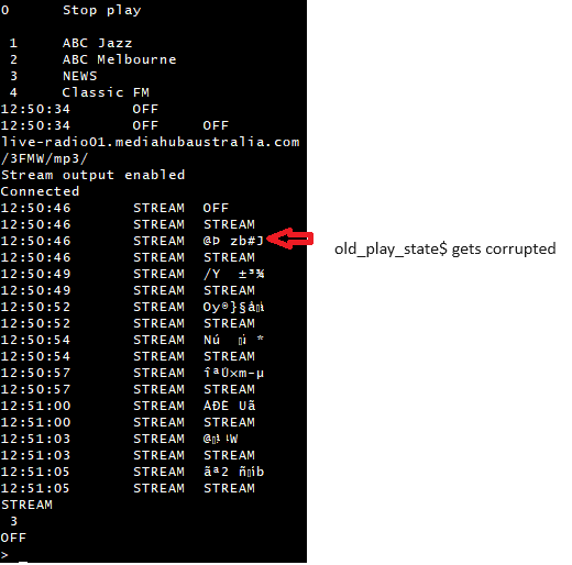 I think we have a corruption problem. Every 3 seconds, a string variable old_play_state$ gets corrupted. If I change the order in the DIM statement line, no corruption (or none noticed yet) ![]() The program: OPTION ESCAPE OPTION EXPLICIT OPTION DEFAULT NONE DIM url_list$(10,2) DIM INTEGER n DIM k$, old_play_state$, play_state$ ' Dim k$, play_state$, old_play_state$ ' this variable order causes corruption DIM buff%(4095),w%,r% ' fill the favorites list 'cls PRINT CHR$(27);"[H";CHR$(27);"[2J" PRINT 0,"Stop play" FOR n = 1 TO 9 READ url_list$(n,1),url_list$(n,2) IF url_list$(n,1) = "END" THEN url_list$(n,1) = "" : url_list$(n,2) = "" EXIT FOR ENDIF PRINT n,url_list$(n,1) NEXT n DO k$ = INKEY$ SELECT CASE k$ CASE "x","X" ' quit program endplay EXIT DO CASE "0" ' end play endplay CASE "1" TO "9" ' change stream endplay PAUSE 500 n= VAL(k$) listen url_list$(n,2) CASE ELSE ' END SELECT PAUSE 10 play_state$ = MM.INFO$(SOUND) IF INSTR(" OFF PAUSED TONE WAV FLAC SOUND STREAM ",play_state$) THEN IF old_play_state$<>play_state$ THEN PRINT TIME$,play_state$, old_play_state$ ' corrupted data old_play_state$ = play_state$ PRINT TIME$,play_state$, old_play_state$ ' should be equal ENDIF ENDIF LOOP END SUB listen url$ LOCAL q$, a$, strm$, k% IF UCASE$(LEFT$(url$,7)) = "HTTP://" THEN url$ = MID$(url$,8) r% = 0 : w% = 0 k% = INSTR(url$,"/") a$ = LEFT$(url$,k%-1) strm$ = MID$(url$,k%) PRINT a$ PRINT strm$ q$="GET " INC q$, strm$ INC q$," HTTP/1.1\r\n" INC q$,"Host: " INC q$,a$ INC q$,"\r\nConnection: close\r\n\r\n" PLAY STREAM buff%(), r%, w% WEB OPEN TCP STREAM a$,80 WEB TCP CLIENT STREAM q$, buff%(), r%, w% END SUB SUB endplay IF MM.INFO$(SOUND)<>"OFF" THEN PRINT MM.INFO$(SOUND) PRINT MM.INFO$(TCPIP STATUS) PLAY STOP PAUSE 100 PRINT MM.INFO$(SOUND) ON ERROR SKIP WEB CLOSE TCP CLIENT ENDIF END SUB ' Display name , url myList: DATA "ABC Jazz","live-radio02.mediahubaustralia.com/JAZW/mp3/" DATA "ABC Melbourne","live-radio04.mediahubaustralia.com/3LRW/mp3/" DATA "NEWS","live-radio02.mediahubaustralia.com/PBW/mp3/" DATA "Classic FM","live-radio01.mediahubaustralia.com/3FMW/mp3/" DATA "END","" Could this help explain some of the distortion when switching streams? I have not noticed the distortion yet. Jim Edited 2024-02-21 12:09 by TassyJim VK7JH MMedit |