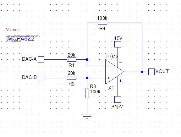 Something like this: This circuit should translate 2V output of the DAC to +/- 10V. It outputs the difference between A and B. So write 4095 to A and 0 to B and you have -10V. St both to 0, or 4096, or 1999, and the output is 0. A=0 and B=4095 is +10V. Easiest is A = 4095-B Resistors must be 1% or better. Volhout Edited 2024-05-01 18:45 by Volhout PicomiteVGA PETSCII ROBOTS |