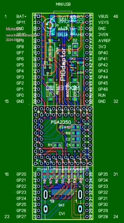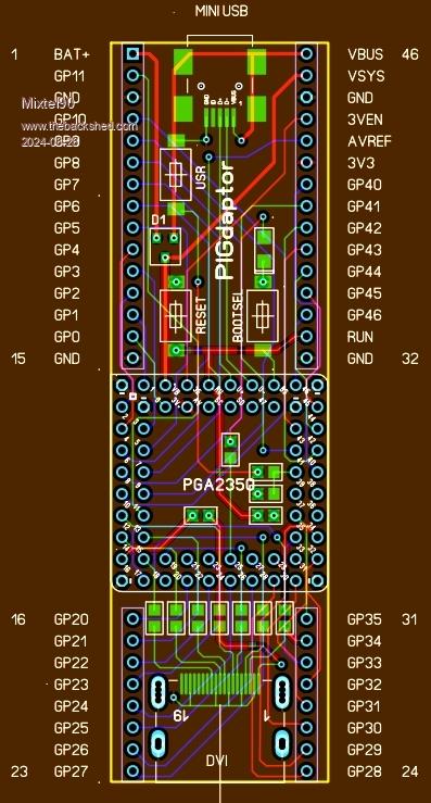 JLCPCB's production cost for these is $7 for 5 unpopulated boards + shipping etc. When you add in the cost of a PGA2350 it's starting to look expensive compared to the Pimorini Pico Plus 2. ================================= Everything to date. There are minor tweaks done. I'm not intending to do anything else now. PIGdaptor gerber.zip PIGdaptor.pdf Edited 2024-08-31 04:25 by Mixtel90 Mick Zilog Inside! nascom.info for Nascom & Gemini Preliminary MMBasic docs & my PCB designs |