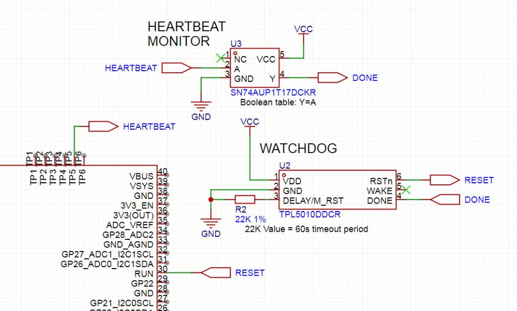 A simple concept: Monitor the heartbeat LED on TP5 and feed the signal to a watchdog timer to reset the Pico after 60 seconds if the heartbeat stops.