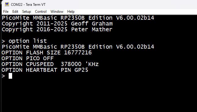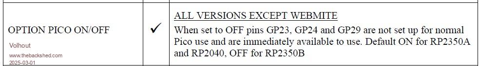 That would make sense. GP25 doesn't need to be controlled by PICO OFF as it has its own options. hehe - Nice one Peter. :) Pico 2x1.6 ;) Edited 2025-03-01 00:25 by Mixtel90 Mick Zilog Inside! nascom.info for Nascom & Gemini Preliminary MMBasic docs & my PCB designs |