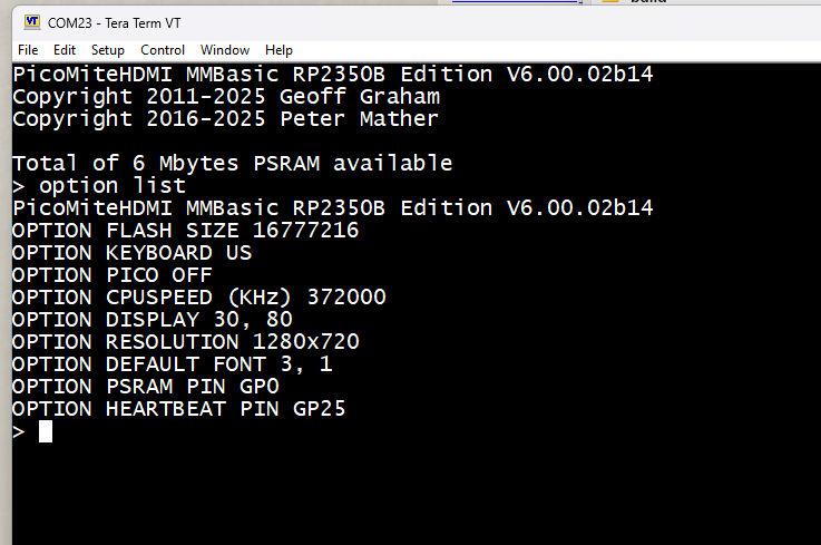 Hi Peter, Is it essential to have option heartbeat. GP25 is not affected by "pico off" right ? Only GP23,GP24, GP29. ![]() Volhout PicomiteVGA PETSCII ROBOTS |