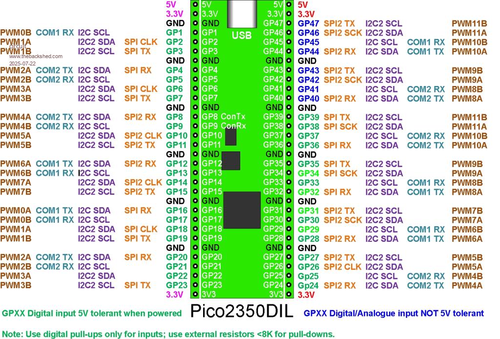 My problem is, how does all this translate to the Pico2350DIL.  I need to power it externally through the 5 volt pins and to simultaneously connect the USB for programming.  I thought to put a diode between my 5 volt supply and the feed to the whole circuit, (Pico2350DIL+various interface chips and 5v IRLED relays etc) but given the not quite so favourable drop-out voltage of the AMS117 at a possible 1.3 volts, there is virtually no headroom over the diode forward voltage drop (and I cannot seem to make out if there is a diode protection on the board between the USB and the regulator).