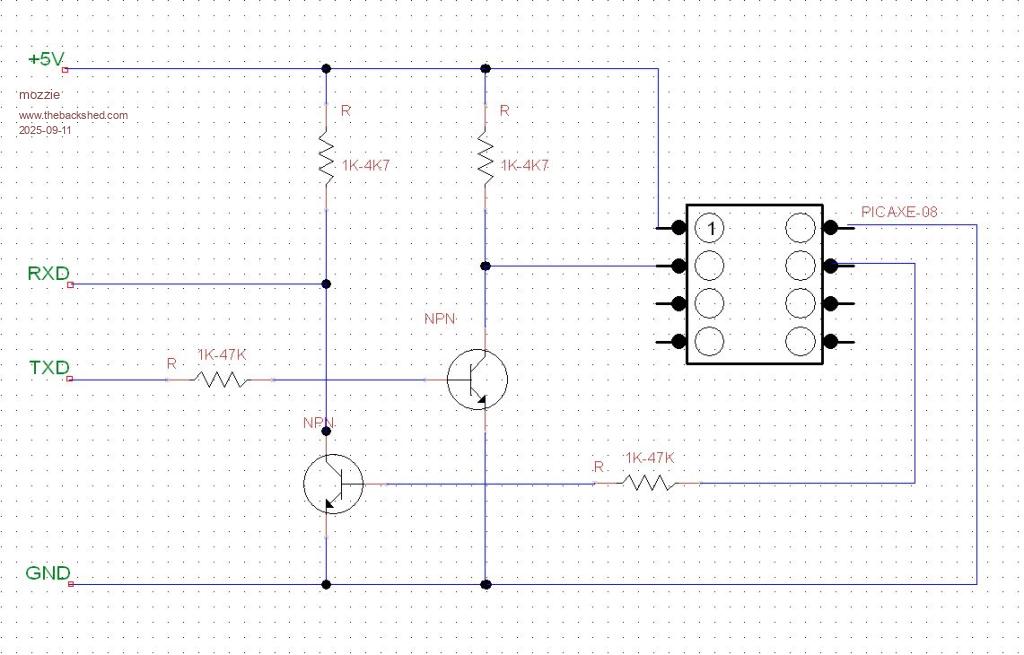 G'day Chris, Good news I hope I have tested the circuit desribed by Phil99 on a Picaxe08 and it works with a generic TTL232 lead