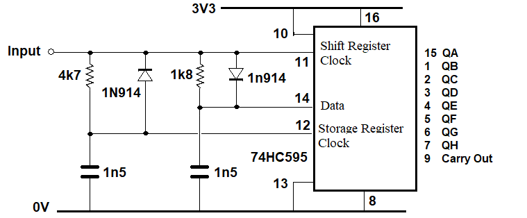 ' pin 11 - A-diode-K - pin 14 (ser. data in) eg 1N914 or 1N4148