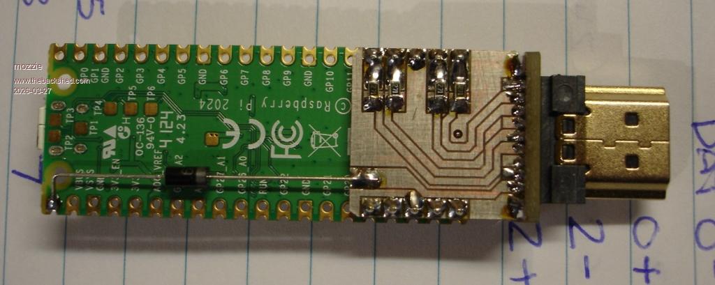 G'day, A bit of reading through the HDMI spec has shown that only HDMI SOURCE devices supply 5V, HDMI SINK devices (monitors / TV's etc) do not. Sadly this means for this type of "PICO_STICK" device we need an external source of power. This being the case, the external USB-Serial device is either plugged into the monitor etc for power or into the PC for power / console. ![]() A wireless keyboard dongle plugged in and off you go ![]() @DDDNS The HDMI sockets do appear to be more robust by design. The extension on the rear of the HDMI plug fits through a milled slot in the PCB and is soldered from the rear, pretty solid. As usual, this is just a proof of concept but it seems like a great idea if someone makes a "proper" version. P.S. This still fits within the outline of the "over-mold" shown in the HDMI spec, this allows approx 21x11.5mm outline (unit is 11x20mm) Regards, Lyle. Edited 2026-03-27 14:52 by mozzie |