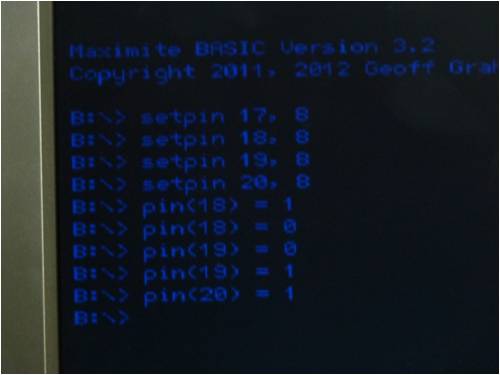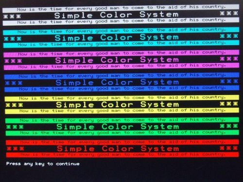 I am new here. This is my first post. Sometimes, coincidences are just too hard to believe. I bought a CGMMSTICK1 board about two weeks ago as my introduction to MMBASIC and MaxiMite-like computers. It is all new to me. After cutting a keyboard connector and VGA connector off an old dead PC motherboard and wiring them into my breadboard setup, I began to think about a simple way to add some color to the video display when using VGA. It works fairly closely to what Nick is describing. Although I do not control the color timing quite down to the scan line level, I do control it closely enough to make a color video display that is stable and solid and did it all just using some passive parts (no ICs, no transistors) and standard MMBASIC 3.2C without any firmware mods at all. I even worked in some blink effects. Only then did I discover this topic on The Back Shed. Too Strange. I am sure this could be done externally using a MaxiMite and many of the other similar machines. If there is interest, I will be glad to supply details about how I did it. Please excuse my image being slightly tilted. I did not have the camera lined up with the monitor very well.