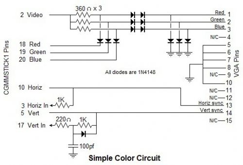 A Simple Color System For The CGMMSTICK1 Computer Part 1 - Hardware I determined that the Video2 signal on pin 3 of the CGMMSTICK1 is actually an input and would be better labelled Horiz In. So in my circuit shown below, you will see that label appearing on that signal instead of Video2.