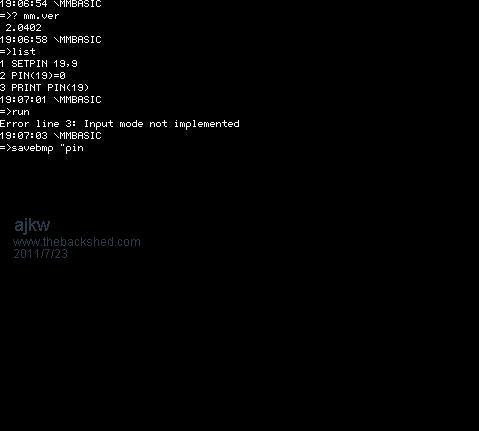 Geoff, I have had a play with reading a pin set as a open collector but the Maximite is giving an error when trying to read the pin "...Input mode not implemented" Pin 19 has a pull up resistor on it. I was expecting a read of 0 with this example. Should this be done another way? Please see the screen shot below. Regards, Anthony.