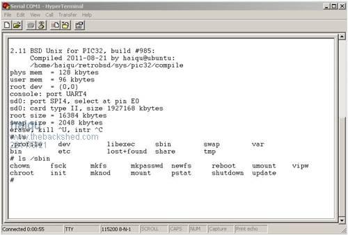 The VirtualMips simulator now has complete support for running the same hardware available on the Maximite as runs on the real hardware. In other words, if you build it and run the simulator instead of the board, I/O works on UART4 and sdcard works on SPI4. This should be useful for anyone wanting to develop the system further. Downloads of RetroBSD are available via the Subversion repository on GoogleCode. unzip, strip, touch, finger, grep, mount, fsck, more, yes, fsck, fsck, fsck, umount, sleep |