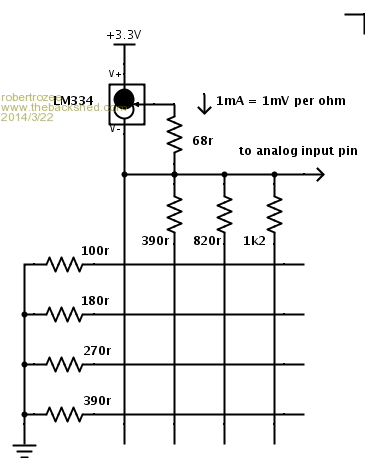 you are right, that a linear solution is possible, but the original circuit still has a few issues. from my own testing, it will not work reliably with the micromite due to the analog input being left floating when no key is pressed (an easy fix), plus it does need a 5v supply to operate with the choice of resistors and temperature compensation of the LM334. upping the current to 1mA and dropping the TC allows for 3v3 operation and better noise immunity. the TC is nice, but adds complexity that most beginners don't need. does anyone know of a better choice than an LM334?