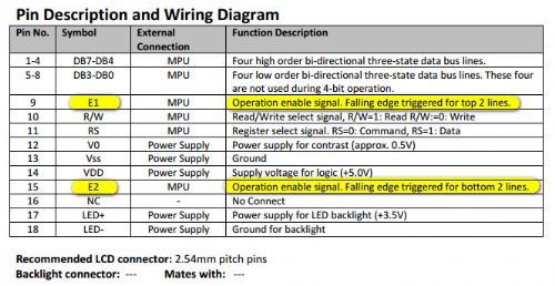 This display looks like it would work using uMite LCD feature, however the top 2 lines are controlled using E1, which is fine, however the bottom two lines use E2 for enable. Is there a way to implement this using maybe an extra output pin and after the first 80 characters are written, the E2 can be enabled and the balance can be written? Maybe an external logic gate or something?