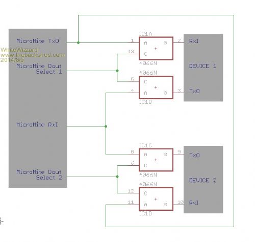 I use two MicroMite I/Os to control the 4066's; one I/O goes to two of the four switches in the 4066 and switches the Rx and Tx from the device 1 to the MicroMite; and the other I/O goes to the other two switches in the 4066 to connect device 2 to the MicroMite. This gives me the ability to disconnect both devices, as well as connecting either device to the MicroMite.