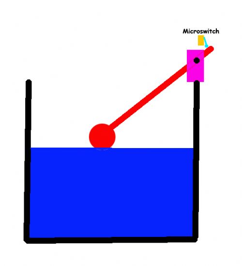 The Pivot and microswitch are OUT of the tank and the long part of the arm is in the tank.. Use the most appropriate sized ball for the job.. BASKETBALL for huge tanks (held on by a wire cage) or pingpong ball if only small tanks.