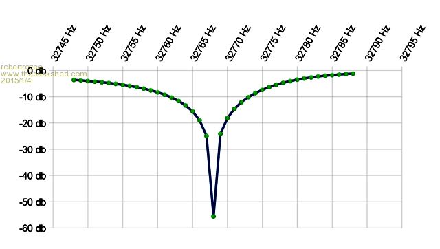 this suggests that if one were to feed one of the PWM outputs to the input, scanning over the range of 32768Hz +/- 1%, it should be possible to detect at the output (using a second pin) the two (fairly symmetrical) edges shown of the graph. even if just using a digital input, the interval is likely to be a few dozen Hz wide - the target frequency will be the average of the two detected edge points.
