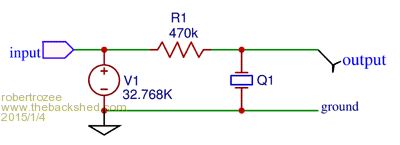 i wanted to look at ways to use a micromite to measure the frequency of a 32kHz watch crystal, using the minimum number of components. if the micromite can measure the crystal frequency, the result will provide a correction factor for the onboard RC oscillator and allow improved timing. it will not be perfect, but for many applications will be ok.