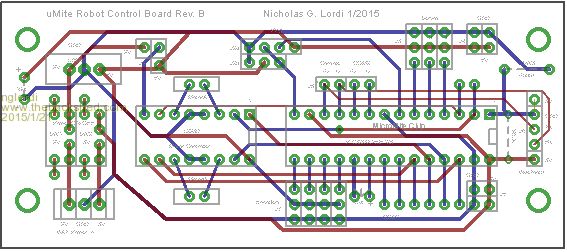 The attached figure (robot.jpg) shows my micromite controlled robot. It consists of an Actobotics platform with a with a control board (umiterc.gif) designed to interface the micromite with a L293D motor controller. The board allows easy connection of up to 3 servos, a ping, bluetooth module and an IR remote sensor (not shown). Two Li-Ion rechargeable batteries power the board. A 3V battery powers the micromite and the bluetooth module. A 9V bsattery regulated to 5V powers all other components. One can select either 5V or 9V to power the motors. The attached MicromiteRCL.pdf file is a document which describes the micromite robot control language. The second document, uMiteCode.pdf, lists the actual code. I would appreciate any comments, suggestions, etc. Nick