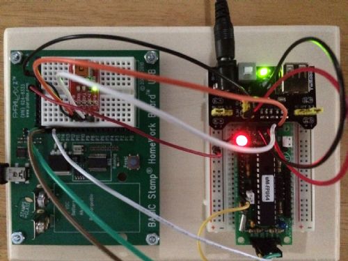 The following is a picture of the setup that I'm using. The BASIC STAMP 2 micro-controller is used to communicate with the FPU64. This is done via a USB Homework Board which is on the left in the picture. The small breadboard on the BS2 board contains a USB-to-TTL board from WhiteWizzard. It is used to communicate directly with the FPU64 chip. On the right side of the picture is a power supply and the FPU64. The power supply provides 5 volts for the BS2 and 3.3 volts for the FPU64.