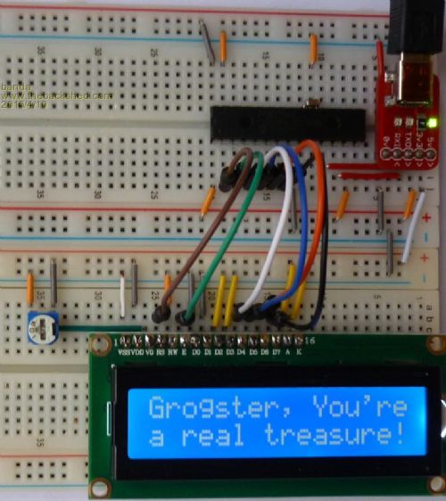 Banda, I have run the test listed above on a 28 pin uMiteII connected to an LCD and here are the voltages at the successful conclusion of the run: LCD pin 1: 0 volts LCD pin 2: 5.1 v - 3.3 volts did not work with any LCD device I tried LCD pin 3: 1.08 v LCD pin 4: 3.28 v LCD pin 5: 0 v LCD pin 6: 0 v LCD pins 7, 8, 9, 10: 4.98 v - They are unconnected in my setup LCD pin 11 & 12: 0 v LCD pin 13: 3.28 v LCD pin 14: 0 v I have tried this test on a number of different LCD modules and had to adjust the potentiometer slightly to get a visible display. The voltage on pin 3 of the LCD ranged between 0 volts and 1.2 volts across the different displays. Voltages higher that 1.5 volts completely blank out the characters. I hope this information helps you get your test running. Regards, -- SiNut The test runs correctly on the following LCD devices: LCD Type Model Number Other information 8 x 2 Microtips NMTC-S0802 Controller unknown, Mouser item 668-NC-S0802XFGNSAY 16 x 1 Data Image CM160100 Controller unknown, http://www.bfdisplay.fr/fiches-techniques/monochromes/DATA IMAGE - CM160100SFAYA-01.pdf 16 x 2 Varitronix MDLS16265LVG Samsung KS0065B, Mouser item 825-DS16265 16 x 2 Pacific Display CDM-16252 Controller ST7066U, http://www.pacificdisplay.com/cdm/CDM-16252.pdf 20 x 4 EDT 20-20072 Controller unknown, eBay items 151114780611 and 371245172693 24 x 2 PC-016ATE Hitachi HD44780A00, eBay item 320859508138 40 x 2 Seiko L4042 Hitachi HD44780A00, http://public.beuth-hochschule.de/~liebmann/webmc6/seiko manual_kurz.pdf |