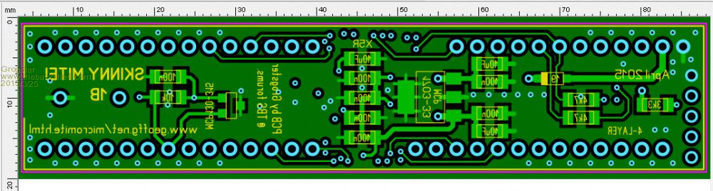 This is designed to directly accept one of WhiteWizzard's USB-serial modules, with the USB cable going away from the SkinnyMite off to the right. WW's USB module could either be plugged in if you used female header strip on the top of the SkinnyMite PCB, or you could permanently solder the WW USB board to the SkinnyMite for a permanent USB connection - albeit with a slightly odd-looking PCB shape if you did it like that permanently. The PCB takes the 5v USB feed from WW's module, but DOES NOT use the 3v3 from WW's USB module, as the SkinnyMite's on-board 3v3 regulator comes out to a pin you can plug into if you need 3v3, and the SkinnyMite regulator can handle more then the 50mA current limit of the WW board 3v3 output. Smoke makes things work. When the smoke gets out, it stops! |