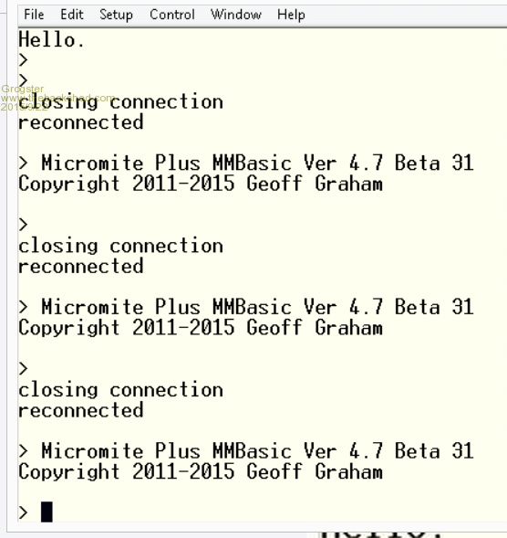 1) Press RESET - this forces a restart of the MM+, and disconnects the USB console at the same time. 2) Issue CTRL+F1 - 'closing connection' prompt comes up. 3) Press RESET again. 4) 'connected' comes up on screen, but MM+ has not run the code, it drops you to the command prompt. I would have expected that once you press reset in the middle of the CTRL-F1 process, that the MM+ would start showing whatever was programmed with autorun on. It doesn't. Is TT operating over USB or a USB-serial converter? Native USB connection in my tests. Have the serial console wires been disconnected? Yes. What does CTRL-F1 do? This is the TT reconnect shortcut of robert.rozee's This may actually not be a problem, it may just be the way I am using it. Smoke makes things work. When the smoke gets out, it stops! |
