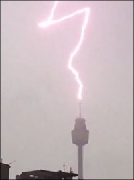 I just finished reading about Jim and his unfortunate run in with lightning and I saw this. It is a photo of the Sydney Tower (aka Centrepoint). The mast that was hit has some antennas. Just as well you didn't cop a direct hit like this one Jim. |