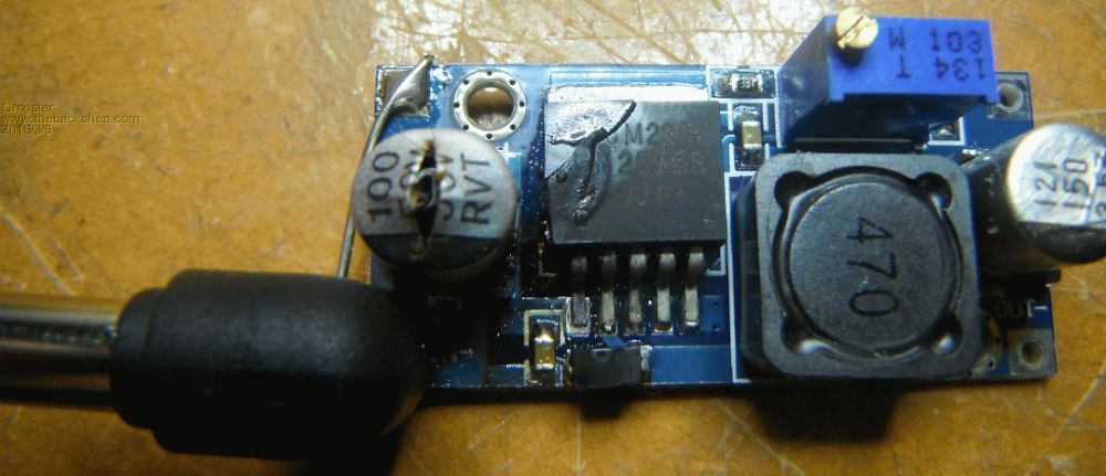This was an impressive failure. The electro on the input turned into a firework, and the regulator glowed deep orange through the crack in it's case. A surprising amount of smoke came from the electro. I instantly knew something was very badly wrong at the first 'Crack!' noise, but by the time I had pulled the power, it was all over..... 36v @ up to 11A rail, so cooking this module was nothing to the PSU. Initial testing following removal of the cooked module reveals no damage, which is lucky. The module was not connected to anything, only the input voltage. Other devices on the same supply don't appear to have suffered for this current surge - lucky me. Oh well - onwards and upwards....... EDIT: Just found that the relay that controls the main supply rail is now welded closed.