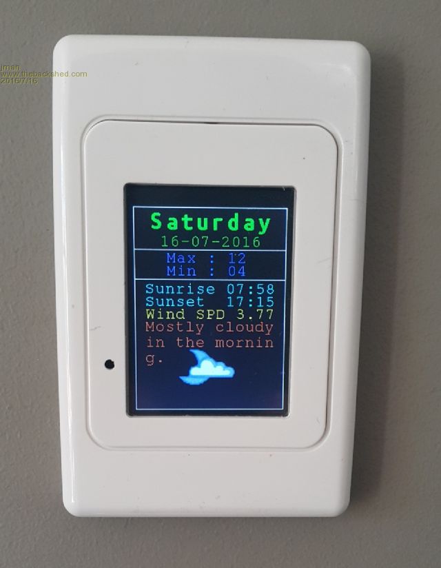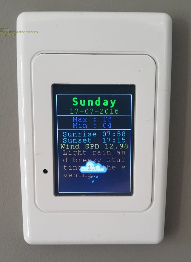 Taking a lead from Addafruit (and their PHP scrips) i am using a webserver to download and parse the Json file doing it this way makes sorting and display the data really easy (you can use any web server that supports PHP most do). The internal data is from a modified Sonoff device that controls my Aircon (topic for another post) this uploads the data to the thingspeak website and the thing.php script downloads the Json file. As my PHP skills are non existant the PHP is not the best but it does the job quite well. Matherp's new ILI9341 driver works a treat and is the main reason for this update. Now we have a bmp background with the text overlayed. Included in the attached zip is the Basic,PHP,Icons and background
