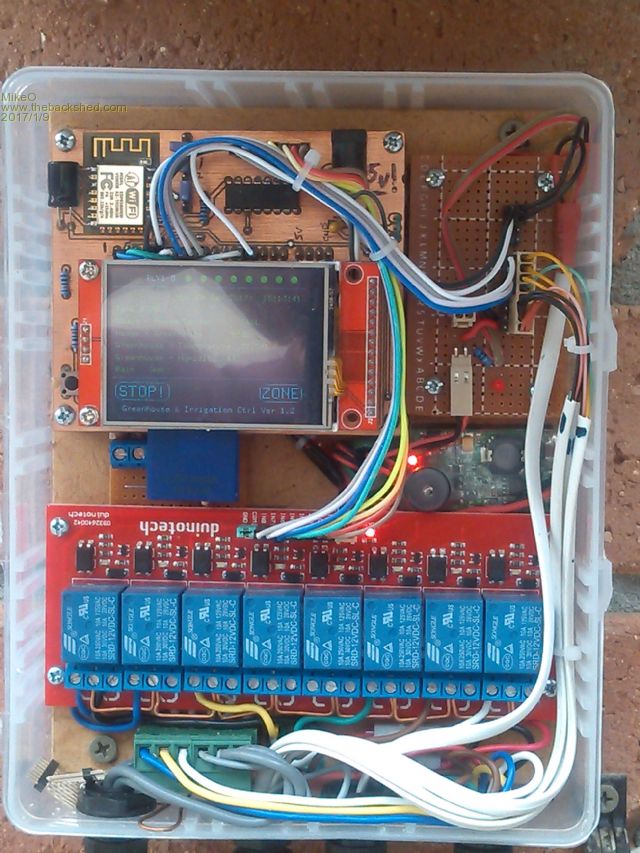 Just commissioned my latest project , this one is set up as a an irrigation controller for the Garden and Greenhouse but it could be used for other timed repeatable tasks. Mine has timed tasks for 2 garden areas and Greenhouse, misting for greenhouse, Exhaust fan for greenhouse, 2 water flow sensors and 10000 ltr tank level sensor. Timed tasks can be up to 5 On/Off cycles per day/area, days of the week etc. Total water usage monitoring, usage per day exceeded per day will trigger override. Configuration Set up is via Wifi , sent by complete file or by single line. ![]() ![]() Sample config file. 1,Z1-Bed.1,W,1,0123456,08:00,08:05,09:00,09:00,09:00,09:00,09:00,09:00 2,Z2-Bed.2,W,0,0123456,00:00,00:00,09:00,09:0 3,Z3-GH.Tank,En, 4,Z4-Spare.1 5,Z5-Spare.2 6,Z6-GH.Water,W,1,0123456,00:00,00:00,12:58,13:50 7,Z7-GH.Mist,,30,30 8,Z8-GH.Fan,En,30,27 9,Usage Greenhouse-House and Garden,0,0 10,Max Daily Usage,500 Main code for this application is below but is also supported by a bunch of code in the library and firmware in the ESP8266 Wifi module. 'http://www.codenquilts.com.au 'Michael Ogden June 2016 'screen functions Geoff Graham 'water flow code - TassyJim 'Greenhouse and Irrigation controller 'v1.2 fixed problem with Run/Stop toggling itself. 'Using MXWifi2.9 or 170MXwifi Library code Option Explicit Option Default Integer Option autorun On 'Constants const Sver$="Ver 1.2" Const NumofMonth$="JAN,FEB,MAR,APR,MAY,JUN,JLY,AUG,SEP,OCT,NOV,DEC" CONST STRB=24 : SETPIN STRB,DOUT:PIN(STRB)=1 'CONFIGURE i/o strobe pin Dim wholedate$ 'Define I/O SETPIN 17, CIN 'House Flow SETPIN 18, CIN 'GHouse Flow 'setpin 10, dout 'Redled setpin 10,din,PULLUP 'water tank level High setpin 9,din,PULLUP 'water tank level Low 'Global variables Dim Integer key_coord(5, 5) Dim String key_caption(5) Dim Integer c ''Flag Variable Dim integer flag(13) '0=err '1=timeout '2=Relay memory '3=display update '4=Alarms On '5=Alarms Off '7=time '8=ntp '9=busy '10=override '11=Watersensors '12=Flashsave '13=TankFill relay(0) ' ensure all relays are off Dim Integer idpdata(10) 'general array Dim string results(11) length 10 'data results array '1=Ghouse temp '2=ghouse Hum '3=rain '4=Tank Level '5=House Flow '6=GHouse Flow '7=Tank Level '8=GHouse Flow '9=Total Tank Flow '10=24hr Usage Dim Secs dim preset,x,Errorflag dim ErrorMsg$ dim AlarmTime,NO_CLS,backup 'Print "Greenhouse & Irrigation Ctrl "+sver$ Pusc 'Power up system check initWiFifile 1 'call initialise WiFi file transfer library, set comm port to use 'intialise I/O Var Restore cls Text MM.HRes/2, MM.VRes/2, "INITIALISE", CM, 1,2, RGB(white) 'intialise modules 'Initialise Arrays if Touch(x) <> -1 then backup=0 Text MM.HRes/2, MM.VRes/2, "DEFAULTS RESTORED", CM, 1, 1, RGB(white) end if pause 1000 ' restore the settings. If this is the first time set the defaults If backup = 0 Then backup=1 results(10)="0" Var Save backup,results() EndIf for x=1 to 11 print "Results:";x;" ";results(x) next for x=1 to 10 print "Config:";x;" ";cfgdata(x) next 'interupts Settick 1000 ,T1,1 'establish seconds "Tick Timer" settick 300000,SavetoFlash,3 flag(3)=1 'content update flag(8)=1 'NTP flag 'debug=1 '*** start main program loop Do 'StartTime = Timer Watchdog 60000 Do While Touch(x) <> -1 Loop ' draw the main menu options if NO_CLS=0 then CLS if preset=0 then Text 80, 10,"RLY1-8" , CM, 1,1, RGB(white) showrelays DrawButtonOnly 3, "ZONE",245,155,70 if flag(10)=0 then DrawButtonOnly 0, "STOP!",5,155,90 else DrawButtonOnly 0, " RUN ",5,155,90 end if No_CLS=1 else For x=1 To 8 'clear relay leds Circle 100+x*25,10, 5, 0, 1, 0, rgb(black) next Text MM.HRes/2, 10,"Menu " + parse$(cfgdata(preset),1) , CM, 1,2, RGB(white) DrawButtonOnly 0, "< ",5,155,70 DrawButtonOnly 1, "ON",85,155,70 DrawButtonOnly 2, "OFF",165,155,70 DrawButtonOnly 3, "ZONE",245,155,70 end if Line 0, 25, MM.HRes, 25, 1, RGB(210, 210, 210) Line 0, 175, MM.HRes, 175, 1, RGB(210, 210, 210) if errorflag=1 then Text MM.HRes/2,220, errormsg$,c , 1, 1, RGB(RED) else Text MM.HRES/2,220, "Greenhouse & Irrigation Ctrl "+sver$,c , 1, 1, RGB(white) endif ' get the selected button and take action based on the button 'print "main loop" Select Case CheckButtonPress(0, 3) Case 0 if preset=0 then 'print "case zero" if flag(10)=0 then 'if in free run relay(0) flag(10)=1 'set Override flag else flag(10)=0 'set Override flag end if else PReset=0 end if Case 1 if flag(10)=0 or preset=8 then relay(preset,1) 'relay on only in RUN or for Greenhouse Fan Case 2 relay(preset,0) Case 3 No_CLS=0 'clear CLS flag to allow clear screen preset=preset+1 if preset>8 then preset=0 end if End Select flag(3)=1 'ensure screen update 'Print "Loop elapsed time"; Timer-StartTime Loop '***** End main program loop End 'T1 - 1second Tick interrupt 'set up some time flags Sub T1 local x secs=secs+1 'update seconds timer if secs => 86400 then '24 hrs reached secs = 0 'reset counter results(10)="0" 'reset 24hr usage EndIf If flag(1)>0 Then flag(1)=flag(1)-1 if Flag(13)>0 then flag(13)=flag(13)+1 Text 105,35, wholedate$ + " " + time$,L , 1, 1, RGB(green) if secs mod 25 = 0 Then 'every 25 secs if flag(8)=1 then print "Try to get NTP data" xbsend "time:" 'try to get NTP time data end if end if if secs mod 5 = 0 Then FLAG(3)=1 'content update endif if secs mod 10 = 0 Then FLAG(11)=1 'read water sensors EndIf if secs mod 3600 = 0 then 'every 60 mins FLAG(8)=1 'set NTP flag endif if secs mod 15 = 0 then 'every 15 secs if flag(4)=0 then FLAG(4)=1 'Check Alarms On endif if secs mod 17 = 0 then 'every 17 secs if flag(5)=0 then FLAG(5)=1 'Check Alarms Off endif End Sub '*************** Specific Subs/Functions ********** SUB WaterSensors local integer flow1,flow2,range1 flow1=PIN(17) flow2=PIN(18) 'flow2=19003 'bench testing print "Flows ";flow1;" ";flow2 results(8)=str$(val(results(8))+(flow1/330 MOD 1000000),8,0," ")' ghouse results(9)=str$(val(results(9))+(flow2/330 MOD 1000000),8,0," ")' tank results(10)=str$(val(results(10))+(flow2/330 MOD 1000000),8,0," ")' 24hrs use 'reset flows SETPIN 1