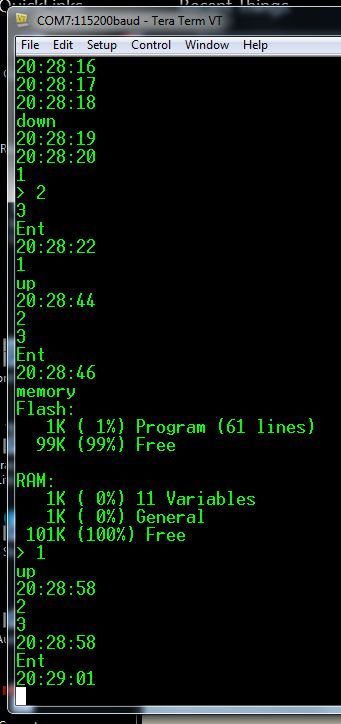 Evening Gent's... I wanted to check this with everyone, because it's probably something stupid I am doing.. But, maybe not.... I finally got some playtime in Sunday with the new beta code (v5.3B10) and was starting to build a simple setup screen for the RTC...The Car facts: I am running on an E-100 board with the RTC module installed in back. I have a SDD1963 based 4.3" LCD, passing all tests, touched calibrated with click sound, SD card pushed in and confirmed working... ' RTC Setup Test Const time_display_box=1 Const yer_val_box=2 Const yer_label_box=3 Const mth_val_box=4 Const mth_label_box=5 Const day_val_box=6 Const day_label_box=7 Const hrs_val_box=8 Const hrs_label_box=9 Const min_val_box=10 Const min_label_box=11 'Dim old_date As string length 10 'Dim old_time As string length 10 'Dim not_touched =1 CLS GUI setup 1 GUI displaybox time_display_box,0,0,300,20,RGB(yellow),RGB(black) CtrlVal(time_display_box)="test" Font 5 GUI numberbox yer_val_box,20,30,100,50,RGB(yellow),RGB(blue) CtrlVal(yer_val_box)=Val(Mid$(Date$,7,4)) ' extract year data Font 1 GUI interrupt pen_down,pen_up SetTick 1000,check_time Do Loop Sub check_time 'Do 'refresh_line=GetScanLine() 'Print refresh_line 'Loop While refresh_line<50 Print Time$ 'Print refresh_line CtrlVal(time_display_box)=Time$ End Sub Sub MM.KEYPRESS ref As integer, caption As string Print caption If ref=yer_val_box And caption="Ent" Then If Val(CtrlVal(yer_val_box))>4000 Then CtrlVal(yer_val_box)="4000" If Val(CtrlVal(yer_val_box))<0 Then CtrlVal(yer_val_box)="0" EndIf EndIf End Sub Sub pen_down Print "down" End Sub Sub pen_up Print "up" End Sub This where I got so far... Now, when I run this, I get whats expected on the time_display_box object... I touched a blank area of the screen to generate a few pen "down-up" events.. So far, so good... Then I touch the yer_val_box and enter the new year data.. I hit the "Ent" button and get what I expect back into yer_val_box... But then I notice the interrupts are no longer working... Humm... Now, it took a few tries and head scratching, but, I finally noticed it.. In this "snip" pix, notice the "command prompt" .. Yep, the program is still runing ok, but, the firmware has returned, and (not shown here), you can type commands and the firmware answers back, AND the yer_val_box is still active and working too..! However, the rest of the INT subs are no longer active... Not sure whats going on here.. The program should stay trapped in the Do loop... I can continue building, but was wondering if anyone else have seen this behavior..? But, maybe it's just something stupid I am doing..! BTW - What is the correct numbers to enter for the GETSCANLINE function..? Thanks for any feedback on this stuff..!! |