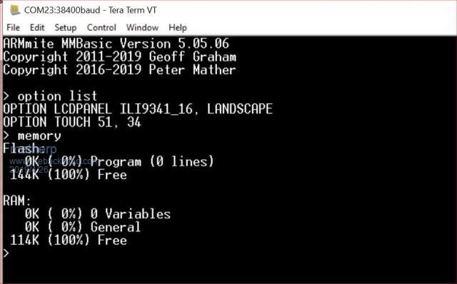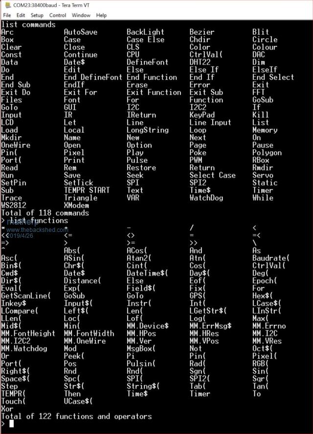 Here is the current beta firmware, let me know how you get on: 2019-05-03_035158_mmbasic.zip Special function pins: #define INT1PIN 98 //PE1 #define INT2PIN 2 //PE3 #define INT3PIN 3 //PE4 #define INT4PIN 67 //PA8 #define IRPIN 1 //PE2 // I2C pin numbers #define P_I2C_SCL 92 //PB6 #define P_I2C_SDA 93 //PB7 #define P_I2C2_SCL 47 //PB10 #define P_I2C2_SDA 48 //PB11 // COMx: port pin numbers #define COM1_TX_PIN 68 //PA9 USART1 #define COM1_RX_PIN 69 //PA10 #define COM2_TX_PIN 63 //PC6 USART6 #define COM2_RX_PIN 64 //PC7 #define COM3_TX_PIN 23 //PA0 UART4 #define COM3_RX_PIN 24 //PA1 #define COM4_RX_PIN 25 //PA2 USART2 #define COM4_TX_PIN 26 //PA3 // SPI pin numbers #define SPI_CLK_PIN 89 //PB3 #define SPI_INP_PIN 90 //PB4 #define SPI_OUT_PIN 91 //PB5 // SPI2 pin numbers #define SPI2_CLK_PIN 52 //PB13 #define SPI2_INP_PIN 53 //PB14 #define SPI2_OUT_PIN 54 //PB15 // // DAC pin numbers #define DAC_1_PIN 29 //PA4 #define DAC_2_PIN 30 //PA5 // // PWM pin numbers #define PWM_CH1_PIN 31 //PA6 - PWM1A/TIM3_CH1 #define PWM_CH2_PIN 32 //PA7 - PWM1B/TIM3_CH2 #define PWM_CH3_PIN 35 //PB0 - PWM1C/TIM3_CH3 #define PWM_CH4_PIN 36 //PB1 - PWM1D/TIM3_CH4 #define PWM_CH5_PIN 59 //PD12 - PWM2A/TIM4_CH1 #define PWM_CH6_PIN 95 //PB8 - PWM2A/TIM4_CH3 #define PWM_CH7_PIN 96 //PB9 - PWM2A/TIM4_CH4 #define PWM_CH8_PIN 4 //PE5 - PWM3A/TIM9_CH1 #define PWM_CH9_PIN 5 //PE6 - PWM3A/TIM9_CH2 #define KEYBOARD_CLOCK 77 //PA15 #define KEYBOARD_DATA 84 //PD3 #define NRF_CE_PIN 92 //PB6 #define NRF_CS_PIN 93 //PB7 #define NRF_IRQ_PIN 95 //PB8 #define F_CS 35 //PB0 All pins: const struct s_PinDef PinDef100[NBR_PINS_100CHIP + 1]={ { NULL, 0, PUNUSED , NULL, 0}, // pin 0 { GPIOE, GPIO_PIN_2, DIGITAL_IN | DIGITAL_OUT , NULL, 0}, // pin 1 IR { GPIOE, GPIO_PIN_3, DIGITAL_IN | DIGITAL_OUT , NULL, 0}, // pin 2 Count 3/KEY1 { GPIOE, GPIO_PIN_4, DIGITAL_IN | DIGITAL_OUT , NULL, 0}, // pin 3 Count 4/KEY0 { GPIOE, GPIO_PIN_5, DIGITAL_IN | DIGITAL_OUT , NULL, 0}, // pin 4 PWM-3A { GPIOE, GPIO_PIN_6, DIGITAL_IN | DIGITAL_OUT , NULL, 0}, // pin 5 PWM-3B { NULL, 0, PUNUSED , NULL, 0}, // pin 6 VBAT { GPIOC, GPIO_PIN_13, DIGITAL_IN | DIGITAL_OUT, NULL, 0}, // pin 7 { NULL, 0, PUNUSED , NULL, 0}, // pin 8 OSC32_IN { NULL, 0, PUNUSED , NULL, 0}, // pin 9 OSC32_OUT { NULL, 0, PUNUSED , NULL, 0}, // pin 10 VSS { NULL, 0, PUNUSED , NULL, 0}, // pin 11 VDD { NULL, 0, PUNUSED , NULL, 0}, // pin 12 OSC8_IN { NULL, 0, PUNUSED , NULL, 0}, // pin 13 OSC8_OUT { NULL, 0, PUNUSED , NULL, 0}, // pin 14 NRST { GPIOC, GPIO_PIN_0, DIGITAL_IN | DIGITAL_OUT | ANALOG_IN , ADC1, ADC_CHANNEL_10}, // pin 15 { GPIOC, GPIO_PIN_1, DIGITAL_IN | DIGITAL_OUT | ANALOG_IN , ADC2, ADC_CHANNEL_11}, // pin 16 { GPIOC, GPIO_PIN_2, DIGITAL_IN | DIGITAL_OUT | ANALOG_IN , ADC3, ADC_CHANNEL_12}, // pin 17 { GPIOC, GPIO_PIN_3, DIGITAL_IN | DIGITAL_OUT | ANALOG_IN , ADC1, ADC_CHANNEL_13}, // pin 18 { NULL, 0, PUNUSED , NULL, 0}, // pin 19 VDD { NULL, 0, PUNUSED , NULL, 0}, // pin 20 VSSA { NULL, 0, PUNUSED , NULL, 0}, // pin 21 VREF+ { NULL, 0, PUNUSED , NULL, 0}, // pin 22 VDDA { GPIOA, GPIO_PIN_0, DIGITAL_IN | DIGITAL_OUT | ANALOG_IN , ADC1, ADC_CHANNEL_0}, // pin 23 COM3-TX/COUNT-0/WK_UP { GPIOA, GPIO_PIN_1, DIGITAL_IN | DIGITAL_OUT | ANALOG_IN , ADC1, ADC_CHANNEL_1}, // pin 24 COM3-RX { GPIOA, GPIO_PIN_2, DIGITAL_IN | DIGITAL_OUT | ANALOG_IN , ADC1, ADC_CHANNEL_2}, // pin 25 COM4-TX // { GPIOA, GPIO_PIN_3, DIGITAL_IN | DIGITAL_OUT | ANALOG_IN , ADC1, ADC_CHANNEL_3}, // pin 26 COM4-RX { NULL, 0, PUNUSED , NULL, 0}, // pin 27 VSS { NULL, 0, PUNUSED , NULL, 0}, // pin 28 VDD { NULL, 0, PUNUSED , NULL, 0}, // pin 29 DAC-1 { NULL, 0, PUNUSED , NULL, 0}, // pin 30 DAC-2 { GPIOA, GPIO_PIN_6, DIGITAL_IN | DIGITAL_OUT | ANALOG_IN , ADC1, ADC_CHANNEL_6}, // pin 31 PWM-1A +LED-D2 { GPIOA, GPIO_PIN_7, DIGITAL_IN | DIGITAL_OUT | ANALOG_IN , ADC1, ADC_CHANNEL_7}, // pin 32 PWM-1B +LED-D3 { GPIOC, GPIO_PIN_4, DIGITAL_IN | DIGITAL_OUT | ANALOG_IN , ADC2, ADC_CHANNEL_14}, // pin 33 { GPIOC, GPIO_PIN_5, DIGITAL_IN | DIGITAL_OUT | ANALOG_IN , ADC2, ADC_CHANNEL_15}, // pin 34 T_IRQ { GPIOB, GPIO_PIN_0, DIGITAL_IN | DIGITAL_OUT | ANALOG_IN , ADC1, ADC_CHANNEL_8}, // pin 35 PWM-1C/F_CS { NULL, 0, PUNUSED , NULL, 0}, // pin 36 LCD_BL { GPIOB, GPIO_PIN_2, DIGITAL_IN | DIGITAL_OUT , NULL, 0}, // pin 37 { NULL, 0, PUNUSED , NULL, 0}, // pin 38 FSMC_D4 { NULL, 0, PUNUSED , NULL, 0}, // pin 39 FSMC_D5 { NULL, 0, PUNUSED , NULL, 0}, // pin 40 FSMC_D6 { NULL, 0, PUNUSED , NULL, 0}, // pin 41 FSMC_D7 { NULL, 0, PUNUSED , NULL, 0}, // pin 42 FSMC_D8 { NULL, 0, PUNUSED , NULL, 0}, // pin 43 FSMC_D9 { NULL, 0, PUNUSED , NULL, 0}, // pin 44 FSMC_D10 { NULL, 0, PUNUSED , NULL, 0}, // pin 45 FSMC_D11 { NULL, 0, PUNUSED , NULL, 0}, // pin 46 FSMC_D12 { GPIOB, GPIO_PIN_10, DIGITAL_IN | DIGITAL_OUT , NULL, 0}, // pin 47 I2C2-SCL { GPIOB, GPIO_PIN_11, DIGITAL_IN | DIGITAL_OUT , NULL, 0}, // pin 48 I2C2-SDA { NULL, 0, PUNUSED , NULL, 0}, // pin 49 VCAP { NULL, 0, PUNUSED , NULL, 0}, // pin 50 VDD // { GPIOB, GPIO_PIN_12, DIGITAL_IN | DIGITAL_OUT , NULL, 0}, // pin 51 T_CS { GPIOB, GPIO_PIN_13, DIGITAL_IN | DIGITAL_OUT , NULL, 0}, // pin 52 SPI2-CLK { GPIOB, GPIO_PIN_14, DIGITAL_IN | DIGITAL_OUT , NULL, 0}, // pin 53 SPI2-IN { GPIOB, GPIO_PIN_15, DIGITAL_IN | DIGITAL_OUT , NULL, 0}, // pin 54 SPI2-OUT { NULL, 0, PUNUSED , NULL, 0}, // pin 55 FSMC_D13 { NULL, 0, PUNUSED , NULL, 0}, // pin 56 FSMC_D14 { NULL, 0, PUNUSED , NULL, 0}, // pin 57 FSMC_D15 { GPIOD, GPIO_PIN_11, DIGITAL_IN | DIGITAL_OUT , NULL, 0}, // pin 58 Drive_VBUS_FS { GPIOD, GPIO_PIN_12, DIGITAL_IN | DIGITAL_OUT , NULL, 0}, // pin 59 PWM-2A { NULL, 0, PUNUSED , NULL, 0}, // pin 60 FSMC_A18 { NULL, 0, PUNUSED , NULL, 0}, // pin 61 FSMC_D0 { NULL, 0, PUNUSED , NULL, 0}, // pin 62 FSMC_D1 { GPIOC, GPIO_PIN_6, DIGITAL_IN | DIGITAL_OUT, NULL, 0}, // pin 63 COM2-TX { GPIOC, GPIO_PIN_7, DIGITAL_IN | DIGITAL_OUT, NULL, 0}, // pin 64 COM2-RX { NULL, 0, PUNUSED , NULL, 0}, // pin 65 SDIO_D0 { NULL, 0, PUNUSED , NULL, 0}, // pin 66 SDIO_D1 { GPIOA, GPIO_PIN_8, DIGITA