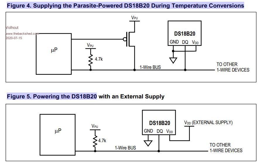 Hi Amnesie, It is fact that the DS18B20 runs from 3.0V...5.5V. If 1 wire is used there is voltage drop across the 4.7k resistor, and you may be looking at 3V at the chip (not 3.3V), I think you even measured 2.97V or so. Not sure if you are using "parasite port, or external power on the DS18B20's. Assuming parasite power: Since these DS18B20's work well on 5V, the bus voltage may be the problem. Just on the edge. What you could do...the CMM2 also has +5V at the connector. Please leave the 4.75k pullup to 3.3V, and add a second resistor 22k to +5V. This will lift the 3V at the DS18B20 to roughly 3.3V. That is not sufficient for the STM32 to have a problem, but could force the DS18B20's to work. Volhout P.S. matherp, do you distinguish between parasite power and external power (in other words, do you actively pull the IO pin high when there is no communication ?). ![]() Edited 2020-07-15 06:02 by Volhout PicomiteVGA PETSCII ROBOTS |