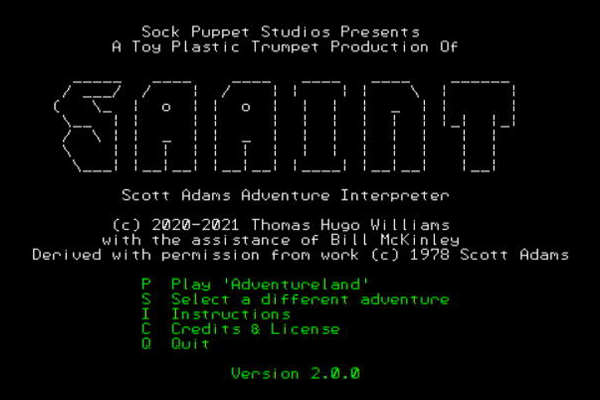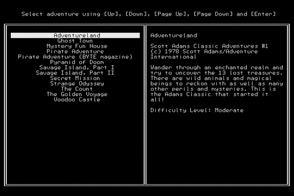 With the kind permission of Scott Adams this release is distributed with the 12 original Scott Adams Classic Adventures. You can also find a dozen or so more adventures by following the links from the SAAINT git repository. Please note that Bill and I did not test all the adventures to completion (or even a significant fraction of them) and I would be eager to hear if you encounter any issues - though be warned, most of the spelling mistakes are Scott Adams originals.