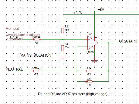 2/ The mains isolation was in a transformer. But the (small) transformer gave additional distortion. (original plan wat to use the transformer to both power the pico and LCD, and use a isolated measurement input. I now use a solid state (opamp) circuit with (dual) 10 Meg ohm high voltage resistors. This is far superior in distortion. Powering the pico will use a phone charger.