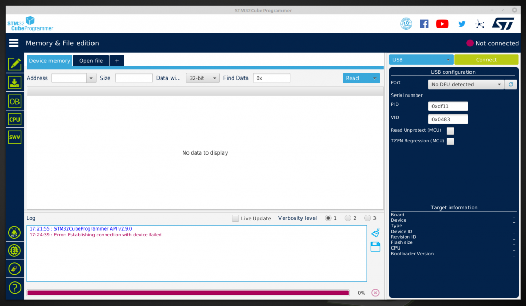Note that the Cube programmer is looking for the DFU with a PID of 0xdf11, and a VID of 0x0483, and that Mint sees the Black Pill module in DFU mode, with EXACTLY those settings - but Cube Programmer just says that no DFU was detected.