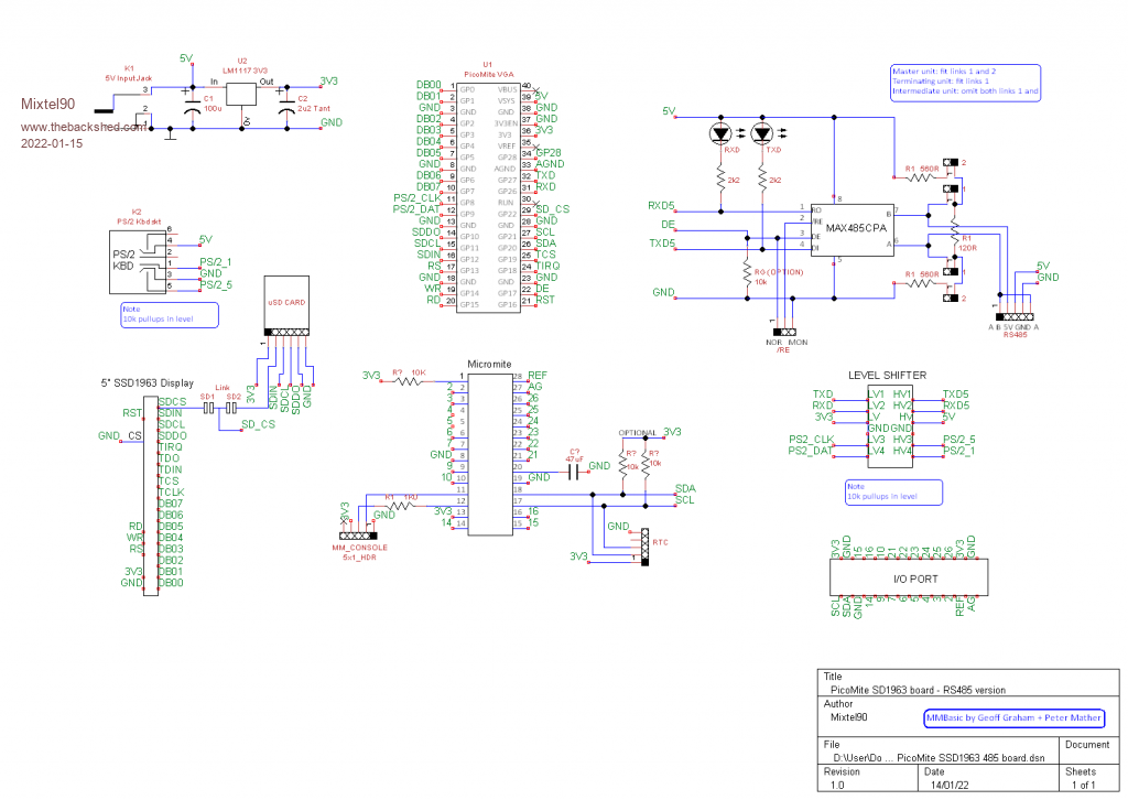 The result of today's playtime: RS485 version. I had to lose the ICSP connector, but that's hardly a deal breaker as all the signals are on the IO connector. Only GP28 is left now. DE is under user control as the PicoMite doesn't appear to support an automatic mode. I2C at 3V3 is available on the IO connector. The odd arrangement of the RS485 connector allows for easy connection of two twisted pairs or a 4-core flat cable (only for short distances, I think, but might be useful). You can also do A+B+Gnd quite easily. I'm only thinking of a Dupont connector here as a controller should be in a box. ![]() Mick Zilog Inside! nascom.info for Nascom & Gemini Preliminary MMBasic docs & my PCB designs |