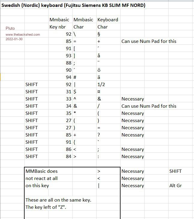 These are the keys that need some fixing. ![]() As you can see there are several differences between what MMBasic displays and what is shown on the keyboard keys. I do not think that all need to be "translated". Indicated the necessary ones in the table. The "<, >, |" key has no action at all in MMBasic. Hopefully you can interpret my table. If not please advice me how to present. /Fred |