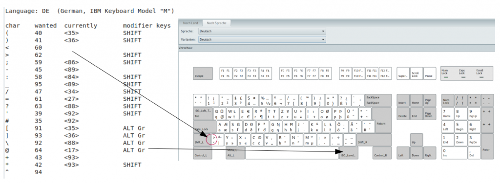 Correction table for my German keyboard (MMBasic V5.07.03pa3) "^" = Shift "^^"= AltGr MMBasic V5.07.03pa3 Ascii(MMBasic) 92 should be 94 = ^ ^86 should be ^59 = ; ^84 should be ^58 = : 89 should be 35 = # ^89 should be ^39 = ' 85 should be 43 = + ^85 should be ^42 = * ^^85 should be ^^126 = ~ 93 should be 180 = (suggestion: ^39 = ') ^93 should be ^96 = ` 91 should be 223 = (suggestion: 92 = \) ^91 should be ^63 = ? ^27 should be ^61 = = ^^27 should be 125 = } ^36 should be ^41 = ) ^^36 should be 93 = ] ^35 should be ^40 = ( ^^35 should be 91 = [ ^34 should be ^47 = / ^^34 should be 123 = { ^33 should be 38 = & ^30 should be 167 = (suggestion: ???) ^^64 should be 64 = @ 90,94,88 (are german Umlauts) The key ("\"+"|") below the "A" and to the right of the left shift key gives no answer. Should give: 60,^62,^^124 Work in progress. I must have missed something ... ![]() @Admin the board software multiplies the backslash \ if I edit my post. ![]() Edited 2022-01-30 07:47 by twofingers causality ≠ correlation ≠ coincidence |