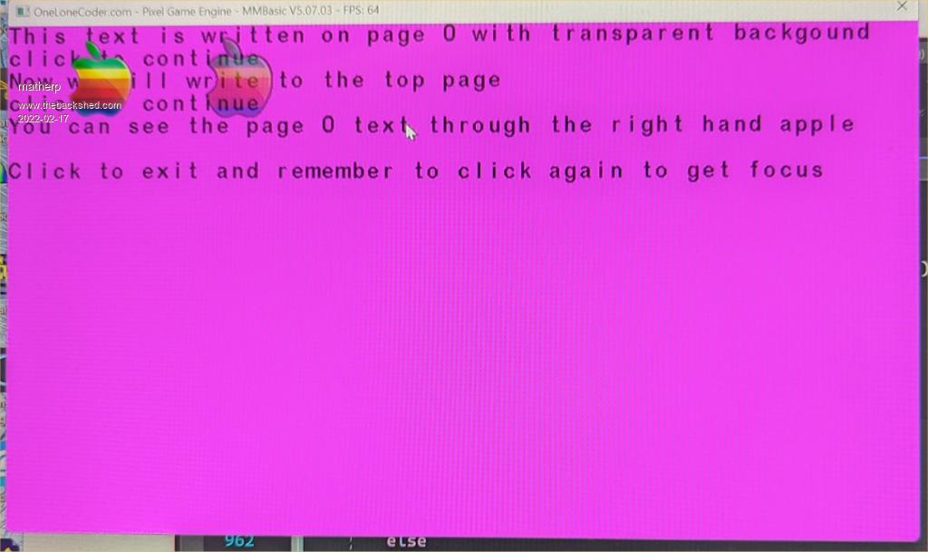 MMBasic for Windows V5.07.03a0 MMBasic.zip The MMBasic for Windows code is now officially past the pre-alpha phase and enters alpha. i.e. most of the functionality is now there and there are not too many reports of issues but there is still work to do. The big change in V5.07.03a0 is support for proper transparency as per the CMM2 The mode command is changed as follows to follow the CMM2 as closely as possible: MODE modeno [,alphaenabled] [,background colour] By default alphaenabled is 0 and the background colour is BLACK To use the second layer set alphaenabled to 1 and optionally choose a background colour Unlike the CMM2 MMbasic for windows uses full ARGB8888 colour in all modes and has a transparency value (A) of 0-255 When you change the mode to alpha by default you are still writing to page 0 and it is cleared to RGB(BLACK)which is opaque. If you want to see the background colour pixels on page 0 must be written with a transparency of less than 255. Use CLS RGB(BLANK) to clear a page to completely transparent. If you set to write to page 1 this will overlay page 0 and the background to the extent that the alpha value of the pixels on PAGE 1 are set (between 0=transparent and 255=opaque). Note when playing with this at the command line you can get very confused so it is easier to understand what is happening with a very simple program. mode 14,1,rgb(magenta) 'set into 2 layer mode with the background set to magenta font 3 print "Click to get focus" mouseclick print "now we will clear page 0 to blank" print "click to continue" mouseclick cls rgb(blank) colour rgb(black),rgb(blank) print "This text is written on page 0 with transparent backgound" print "click to continue" mouseclick print "Now we will write to the top page" print "click to continue" mouseclick page write 1 cls rgb(blank) sprite loadpng 1,"apple" sprite write 1,50,10,1 sprite transparency 1,128 'change the transparency of the sprite sprite write 1,200,10,1 page write 0 print @(0,mm.info(fontheight)*4)"You can see the page 0 text through the right hand apple" print "Click to exit and remember to click again to get focus" mouseclick sprite close all mode 14 colour rgb(white),rgb(black) end sub mouseclick do loop until mouse(l) do loop until not mouse(l) end sub apple.zip Finally a note on the RGB function. RGB(COLOURNAME) will return a fully opaque representation of that colour RGB(red, green, blue) will return a fully opaque representation of that colour use RGB(red, green, blue, trans) to set a partially transparent colour If you must, you can use numerical values directly as colours e.g CLS &H80607080 This will set the transparency to &H80, the blue level to &H60, the green level to &H70 and the red level to &H80. Note that red and blue are reversed compared to the CMM2 if a direct numerical value is used in this way i.e ABRG8888 |