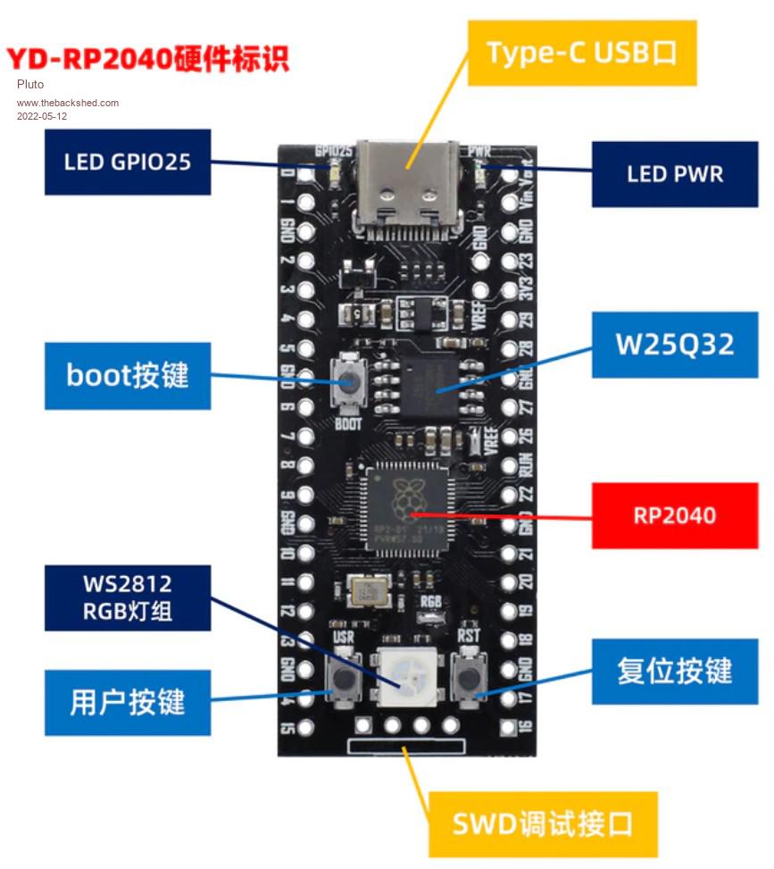 I've used the YD-RP2040 for a while. It seems to be a pretty well thought out alternative but you have to be aware of several points: The WS2812 needs to be enabled via a solder blob link. If you don't enable it then GP23 can be used as an IO pin. VREF also needs to be enabled via a link. By default the ADC pins are all digital. Alternatively you can also inject your own VREF via a flying lead. The maximum speed I've managed to clock them is 252MHz. They work fine for VGA. As the regulator is analogue there is no 3V3EN. That pin is used by GP29. The supply pins are different. The VBUS diode is always in circuit and VBUS isn't available. This makes it unsuitable for USB systems. The diode goes from the USB VBUS to VOUT' VIN has another diode to VOUT. It's very good as a standby supply pin. The USB D+ and D- connections are not available, which also makes it unsuitable for USB systems. I think that's about it. There is a circuit diagram available. YD-2040-2022-V1.1-SCH.pdf I've never had any operational problems with any of mine apart from the speed limitation. Mick Zilog Inside! nascom.info for Nascom & Gemini Preliminary MMBasic docs & my PCB designs |