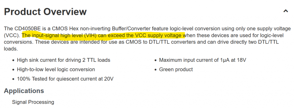 I remember a comment that was something like "be careful because the older CD4050s had a protection diode" but I left it at that.