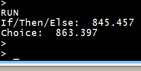 a% = 1 ct% =0 timer = 0 do if a% = 1 then b$ = "hello" else b$ = "bye" end if inc ct% loop until ct% = 10000 print "If/Then/Else: "; timer ct% =0 timer = 0 do b$ = choice(a%,"hello","bye") inc ct% loop until ct% = 10000 print "Choice: "; timer |