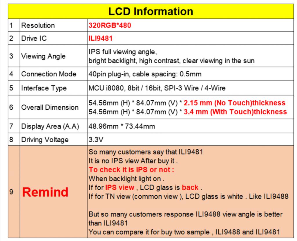 Hi Peter, The display’s PCB looks identical to the ILI9488 board at least from the visible Rear side. The description states SPI 3/4 wire ( see the table) ![]() The ILI9488 that works fine states it is SPI 4 wire so there may be a difference there. If you are interested this is the link of the ILI9481 I bought. ILI9481 I was able to do a GUI Calibrate even though I couldn’t see the display at any BL level so the touch seems to work the back light does work as I can see the LED behind the display change with the BL command. Is there any specific test I can do that can add more information to assist? Kind Regards, Mick Mick's uMite Stuff can be found >>> HERE (Kindly hosted by Dontronics) <<< |