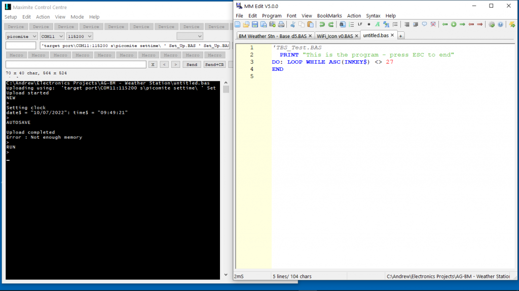 MMEdit 4 uses XMODEM if you do a 'load and run' You can use AUTOSAVE if you load from the chat window. MMEdit 5 uses AUTOSAVE by default. If you drag and drop multiple files onto the control center, it will use XMODEM. It will also use XMODEM for any file that is not BAS or TXT I can't think of any reason for your problem but if you can send me a copy of your MMCC.inf file, I might see something. Rather than reload the program, it is usually worth trying deleting the MMCC.inf and MMEdit5.inf files and letting MMEdit start fresh. Re-installing does not replace those files. I have done a bit if fiddling with the programs, especially the control centre since the last version posted to my website so you could try the attached exes and see if that makes a difference. I have not had any problems loading your example program. Maximite Control Centre Build date: 2022/07/08 Data server on port 50900 started Control server on port 50899 started started C:\Users\Jim\Documents\apps\maximite\apps - Copy\untitled.bas Uploading using: 'target port\COM4:115200 s\picomite Upload started Connected to COM4 at 115200 NEW > AUTOSAVE Upload completed Saved 131 bytes > RUN This is the program - press ESC to end > I am not sure if your extra remarks after the settime is causing problems. I can't see how. MMedit5.zip Windows 64 bit only. I have started work on the file manager. MMCC Mode menu. You can transfer to the 'mite but not from yet. You can also delete multiple files without any "are you sure" prompt so take care. I am looking at saving to the pico flash slots but my NAS is not well so I have been busy rescuing my file history - rather slowly. They always die on the weekend when you can't get bits easily. Jim VK7JH MMedit |