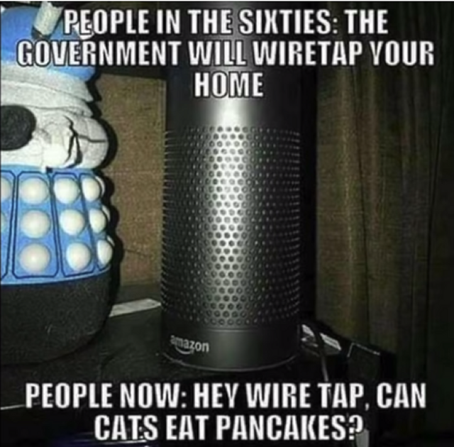 hah! I said exactly this to a friend a while back when he was going to get an "Alexa" (shakes head) - "If the government said everyone had to have a listening device in their homes, there would be uproar. Give it a cute name and charge people $99 for it and they'll line up in droves."