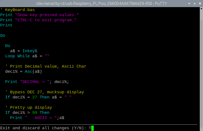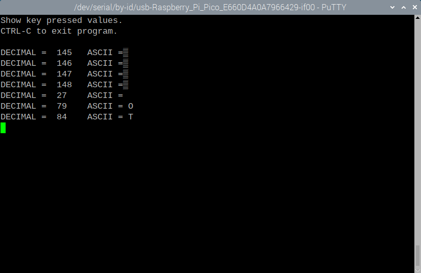 Terminals send an escape string for the function keys The pico internally translates them into the high values you are seeing Example For F3 a terminal will send <esc>[13~ and mmbasic will report it as chr$(147) The bad news is, there are lots of 'standards' XTERM and VT100 etc and what sequence they send varies, especially the shifted function keys. Some of the function keys are also reserved for the terminal program and will not get sent. Your terminal setting are sending a sequence that is not recognized by MMBasic. If the RPi version of Putty allows it, you could try a different function key encoding. Rob's GFXterm or my MMEdit should both work correctly on the RPi. Jim VK7JH MMedit |